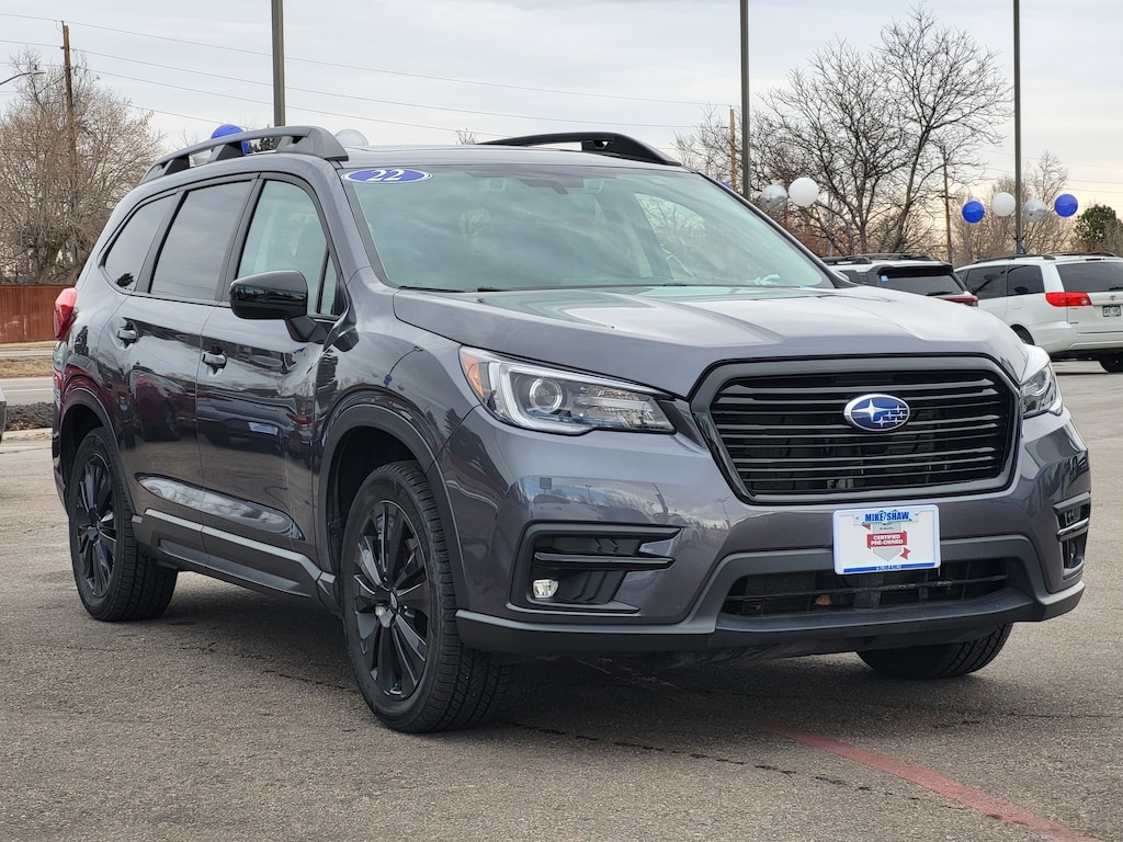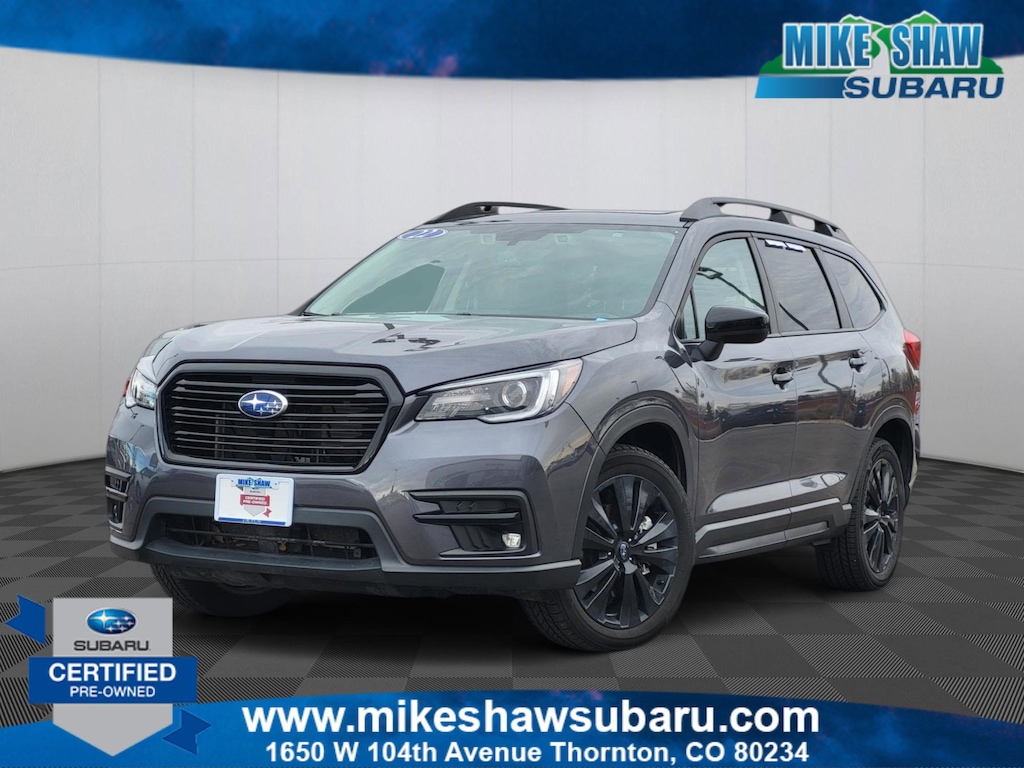 20/26 City/Highway MPG *Another Mike Shaw One-Owner Vehicle, *No Accident History on Carfax*, 2nd Row Captain's Chairs Rear Seatback Protector, 3rd Row Bench Rear Seatback Protector, 3rd row seats: bench, 4-Wheel Disc Brakes, ABS brakes, Air Conditioning, All-Weather Floor Liners, Alloy wheels, Auto High-beam Headlights, Auto-Dimming Mirror w/Compass & HomeLink, Auto-dimming Rear-View mirror, Automatic temperature control, Black Chrome Rear Bumper Cover, Brake assist, Cargo Area Cover, Cargo Tray, CD player, Compass, Delay-off headlights, Dual front impact airbags, Dual front side impact airbags, Dual Glass Panoramic Power Moonroof, Electronic Stability Control, Emergency communication system: STARLINK Safety and Security (Subscription Required), Exterior Parking Camera Rear, Front anti-roll bar, Front dual zone A/C, Front fog lights, Fully automatic headlights, Garage door transmitter: HomeLink, Heated door mirrors, Heated Front Bucket Seats, Heated steering wheel, Illuminated entry, Knee airbag, Outside temperature display, Overhead airbag, Panic alarm, PMR + Navi + TC, Power driver seat, Power Liftgate, Radio: Subaru STARLINK 8.0 Multimedia Nav System, Rear air conditioning, Rear anti-roll bar, Reclining 3rd row seat, Remote keyless entry, Security system, Speed control, Split folding rear seat, Spoiler, STARLINK/Apple CarPlay/Android Auto, StarTex Upholstery, Steering wheel mounted audio controls, Telescoping steering wheel, Tilt steering wheel, Traction control, Trailer Hitch, Trip computer. Odometer is 20889 miles below market average!Magnetite Gray Metallic 2022 Subaru Ascent Onyx Edition Pkg22 AWD