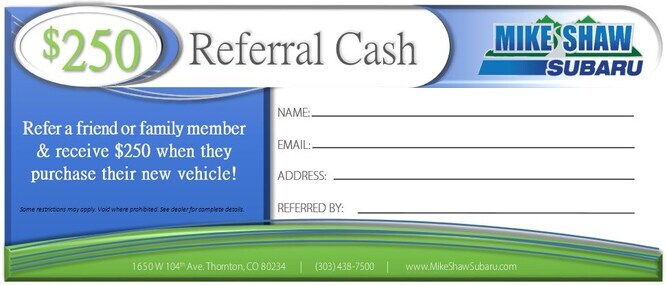 At Mike Shaw Subaru we get a lot of our business from our valued repeat customers and the people they trustingly refer to us. In an effort to reward your trust in us, we are offering you a chance at $250 when you refer a friend, neighbor, relative or anyone else that purchases a car from us. Take advantage of this opportunity now. Print the Referral Cash form below, fill it out and drop it by Mike Shaw Subaru today!