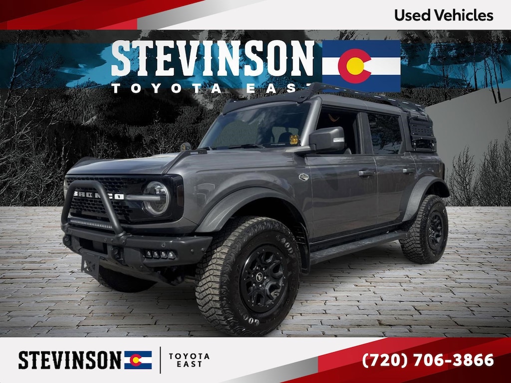2022 Ford Gray Metallic Bronco 2.7L EcoBoost V6 4WDStevinson Toyota East is offering this 2022 Ford Bronco, Wildtrak, in Gray Metallic and Black Leather, only 44671 miles, Navigation/GPS/NAV, Heated Seats, Cooled Seat, Rear Back-Up Camera, Clean CarFax, Blue Tooth, Leather, Tow Package, New Tires!!, Off Road Tires and Wheels!, Apple CarPlay, Android Auto, 12 LCD Capacitive Touchscreen w/Swipe Capability, 2 Smart Charging USB Ports In Dashboard, 360-Degree Camera, Adaptive Cruise Control, Additional Sound Deadening, BLIS Blind Spot Information System, Connected Built-In Navigation, Dual-Zone Electronic Automatic Temperature Control, Equipment Group 354A Lux Package, Evasive Steering Assist, Front Parking Sensors, Heated Steering Wheel, Information on Demand Panel, Navigation System, Navigation system: Connected Navigation, Position-Sensitive Bilstein Shock Absorbers, Radio: B&O Sound System by Bang & Olufsen, Sideview Mirrors, Universal Garage Door Opener, Wireless Charging Pad.