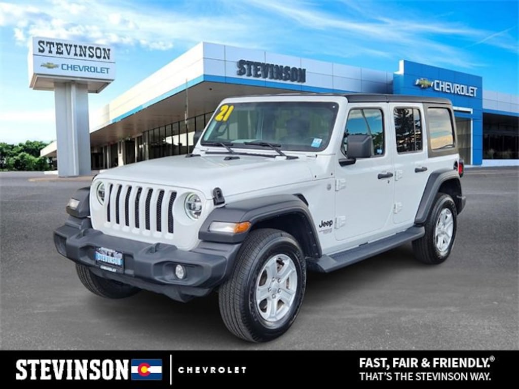 Odometer is 25974 miles below market average! 2021 Jeep Wrangler Unlimited Sport S All Season Tires, Back up Camera, Cruise Control, Keyless Entry, Remote Start, Trailer Hitch, USB / Aux Ports, 240 Amp Alternator, 7 & 4 Pin Wiring Harness, 7.0 Touchscreen Display, 700 Amp Maintenance Free Battery, Air Conditioning w/Auto Temperature Control, Air Filtering, Apple CarPlay, Automatic Headlamps, Auxiliary Switches, Cargo Compartment Floor Mat, Class II Receiver Hitch, Cluster 7.0 TFT Color Display, Cold Weather Group, Convenience Group, Deep Tint Sunscreen Windows, For More Info, Call 800-643-2112, Front 1-Touch Down Power Windows, Front LED Fog Lamps, Google Android Auto, GPS Antenna Input, Heated Front Seats, Heated Steering Wheel, Integrated Center Stack Radio, Leather Wrapped Steering Wheel, LED Headlamp & Fog Lamp Group, LED Premium Reflector Headlamps, Power Heated Mirrors, Quick Order Package 22S Sport S, Radio: Uconnect 4 w/7 Display, Remote Keyless Entry, Security Alarm, SiriusXM Radio Service, SiriusXM Satellite Radio, Speed Sensitive Power Locks, Sport S, Sun Visors w/Illuminated Vanity Mirrors, Technology Group, Trail Rail Management System, Trailer Tow & HD Electrical Group, Universal Garage Door Opener, USB Host Flip, Wheels: 17 x 7.5 Tech Silver Aluminum. CARFAX One-Owner.We're very proud of being in business for over a half-century selling and servicing cars to generations of satisfied Coloradans. Thank you, Colorado, for allowing us to serve your automotive needs for the last 60 years. We look forward too many more years of providing you with the best experience when buying or servicing your Chevrolet. Shop us 24/7 at www.stevinsonchevrolet.com Lakewood, Golden, Aurora, Arvada, Denver, Highlands Ranch, Lone Tree, Morrison, Pine, Windsor, Loveland, Brighton, Broomfield, Parker, Englewood, Littleton, Evergreen, Castle Rock, Westminster, Central City, Boulder, Thornton, Greenwood Village, and BENNETT!